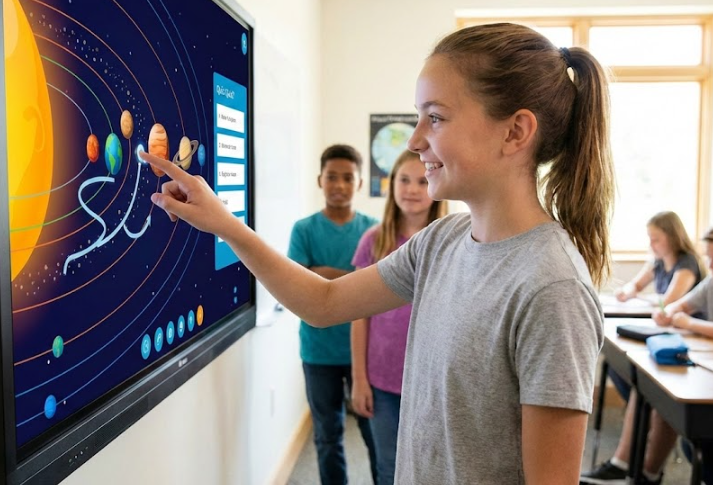 Dengan kemudahan anotasi instan dan fitur multi-touch, siswa diajak untuk tidak hanya menonton, tetapi juga menyentuh, menggambar, dan memanipulasi objek belajar di layar, sehingga menciptakan suasana kelas yang dinamis, menghilangkan kebosanan, dan memicu antusiasme alami siswa untuk memahami pelajaran dengan cara yang jauh lebih menyenangkan.